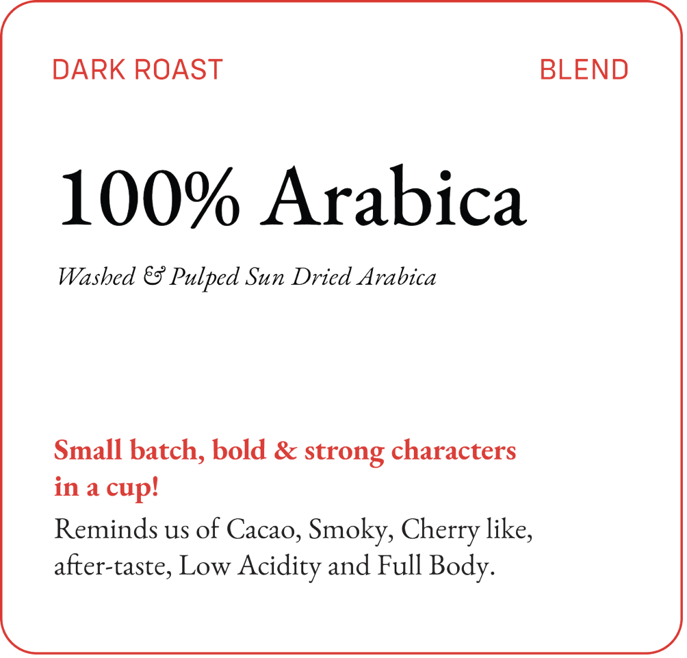 A bold and intense cup with our small-batch Arabica dark roast. This unique blend brings together Arabica beans sourced from two select plantations in Chikmagalur, creating a smoky and cherry-like flavor profile with layered, subtle nuance.